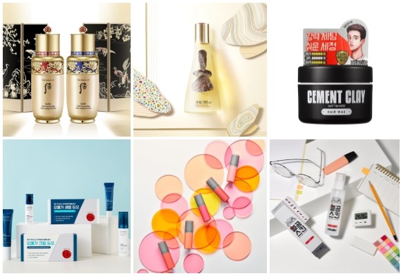 (왼쪽부터 시계방향) LG생활건강 후 비첩 연향세트, 숨37°-김진식 아트 콜라보레이션 에디션, 브로앤팁스 수퍼 클리어 바디워시·열공스킨 미스트 포 슬리피 스튜던트, 아리따움 아쿠아 벨벳 틴트 12종, 이니스프리 오메가 듀오 세트. ⓒ 각 사