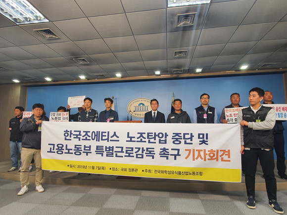 7일 전국화학섬유식품산업노동조합 조에티스지회가 국회 정론관에서 기자회견을 통해 이같이 밝혔다.