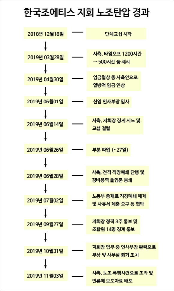 이외에도 사측은 시한부 파업에도 직장 폐쇄를 결정하고 경비용역을 투입했으며, 업무상 이류를 들어 휴가 승인 지연 및 거부 등 조합원 27명 중 17명을 징계했다고도 주장했다.