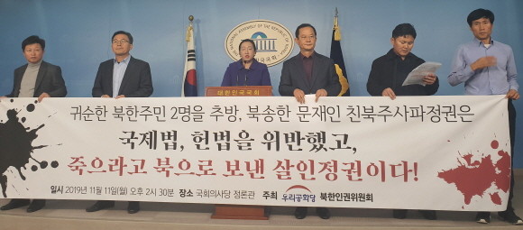우리공화당은 11일 기자회견장에서 문재인 정부가 지난 7일 북한 선원 2명을 강제 북송 조치를 한 것에 대해 비판하면서 국정조사를 요구했다. = 박성현 기자