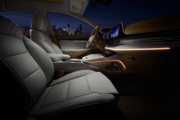 리빙 스페이스로 탈바꿈한 실내는 넓고 길게 뻗은 수평적 디자인을 비롯해 △전자식 변속버튼(SBW) △고급 가죽 소재가 적용된 센터콘솔 △64색 앰비언트 무드램프 △터치식 공조 컨트롤러(현대차 최초 탑재) 등이 고급스러운 감성을 극대화했다.