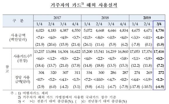 한국은행(이하 한은)이 21일 발표한 '2019년 3분기 중 거주자의 카드 해외사용 실적'에 따르면, 거주자가 카드(신용·체크·직불)로 해외에서 사용한 금액은 전분기(46억7000만달러)대비 1.4% 증가한 47억4000만달러에 달했다.