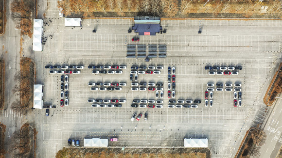 113대의 Model 3 차량이 테슬라 영문 알파벳 모양으로 대열을 이룬 모습. ⓒ 테슬라