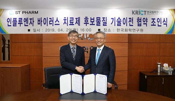 에스티팜-한국화학연구원의 인플루엔자 바이러스 치료제 후보물질 기술이전 협약 체결식에서 김성수 한국화학연구원장(왼쪽)과 김경진 에스티팜 사장이 기념사진을 촬영하고 있다. ⓒ 에스티팜
