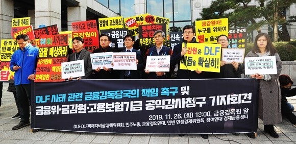 금리연계형 파생결합증권(DLS)·펀드(DLF)피해자비상대책위원회, 민주노총, 민변 및 참여연대 관계자 등이 지난달 26일 오후 서울 여의도 금감원 앞에서 DLF 사태 관련 금융감독당국의 책임 촉구 및 금융위·금감원·고용보험기금에 대한 공익감사 청구 기자회견을 하고 있다. ⓒ 연합뉴스