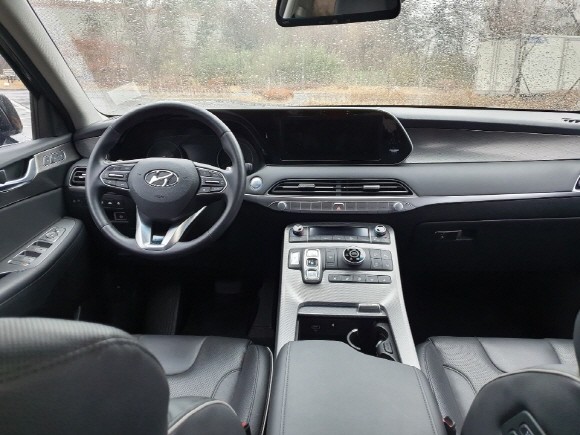 팰리세이드 내부는 동급 최장 축간거리와 함께 수평형 와이드한 레이아웃을 적용해 얼핏 보더라도 '넓다'라는 느낌이 들 정도로 넉넉한 공간을 확보했다. = 전훈식 기자