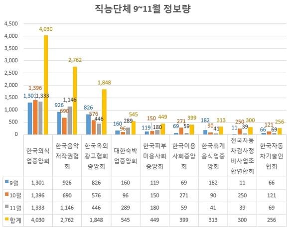 구체적으로 보면 한국외식업중앙회가 4030건(9개 단체 총정보량의 36.97%)이며 △한국음악저작권협회 2762건(25.33%) △한국옥외광고협회중앙회 1848건(16.95%) △대한숙박업중앙회 545건(5.00%) △한국피부미용사회중앙회 449건(4.12%) △한국이용사회중앙회 399건(3.66%) △한국휴게음식업중앙회 313건(2.87%) △전국자동차검사정비사업조합연합회 300건(2.75%) △한국자동차기술인협회 256건(2.35%) 순으로 나타났다.