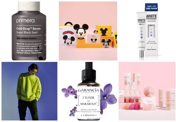 (왼쪽부터 시계방향) 프리메라 슈퍼 블랙 씨드 콜드-드랍TM 세럼 & 크림, 이니스프리 한정판 미키_박스 사전 예약 판매, 메디안 화이트 프로페셔널 프리미엄 미백제, 에이지투웨니스 예리코 로즈 라인 확대 출시, 라페르바 가란시아 단독 론칭, 디자인유나이티드 스타워즈와 협업. ⓒ 각 사