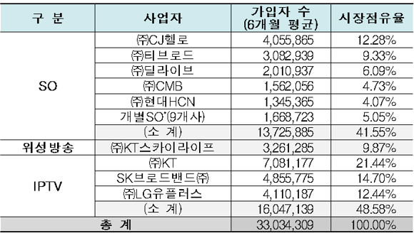2019년 상반기 유료방송 가입자 수 및 시장점유율. ⓒ 과학기술정보통신부