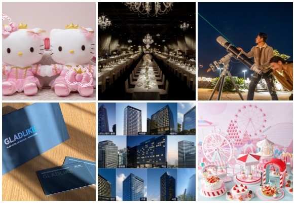 (왼쪽부터 시계방향) 롯데호텔 헬로키티 패키지, 서울신라호텔 홀리데이 와이너리, 제주신라호텔 별자리 관측 프로그램, 워커힐 베리베리 스트로베리, 신라스테이 웜 홀리데이 패키지, 글래드 호텔앤리조트 설 선물 세트. ⓒ 각 사