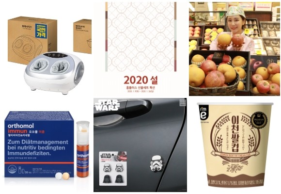 (왼쪽부터 시계방향) 이마트 국민가격 소형 안마기 3종, 홈플러스 설 선물세트 본판매, 롯데마트 황금당도 충주사과와 천안배, 이마트24 이천쌀 아이스크림, 다이소 스타워즈 시리즈, 동아제약 오쏘몰 이뮨 론칭. ⓒ 각 사