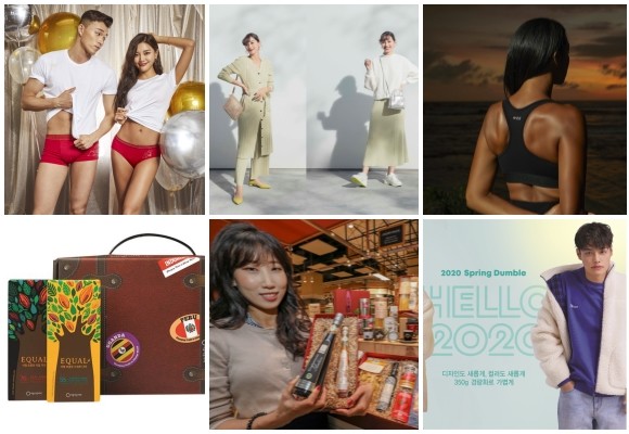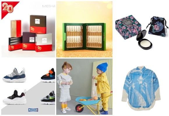 (왼쪽부터 시계방향) 에이블씨엔씨 베스트셀러 기획세트 6종, 네이처리퍼블릭 진생 로얄 실크 앰플 이펙터 4주 프로그램 기획세트, 딥디크 오 카피탈 오 드 퍼퓸, 아크네·프로파간다 협업 한정판 여성 컬렉션, 모이몰른 토들러 라인 신제품 출시, 플레이키즈프로 나이키 에어맥스 타이니 90. ⓒ 각 사