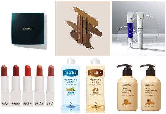 (왼쪽부터 시계방향) 리리코스 퍼펙트 콜라겐 쿠션 XP, 아리따움 매트포뮬라 아이브로우 펜슬, 아이오페 UV쉴드 스킨 에너지 선 SPF50+, 이니스프리 디어펫 샴푸 2종, 애경산업 바세린 바디워시·플로우 오일수 새틴핏 미니립스틱. ⓒ 각 사