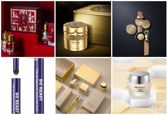(왼쪽부터 시계방향) LG생활건강 후 비첩 예찬세트, 오휘 더 퍼스트 제너츄어 아이크림 그랜드 블루 에디션, 숨 로시크숨마 쉬어 커버 메탈쿠션, CNP 프로폴리스 앰플 액티브 크림, 아모레퍼시픽 홈에스테틱 브랜드 홀리추얼 론칭, 비레디 프라이드 업 아이브로우 포 히어로즈. ⓒ 각 사