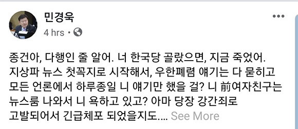 민 의원은 28일 본인의 SNS 계정을 통해 "종건아 다행인 줄 알어. 너 자유한국당을 골랐으면 지금 죽었어"라고 말했다.