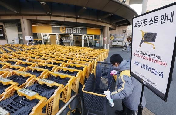 이마트 월계점에서 직원들이 고객용 카트 소독작업을 하고 있는 모습. ⓒ 이마트