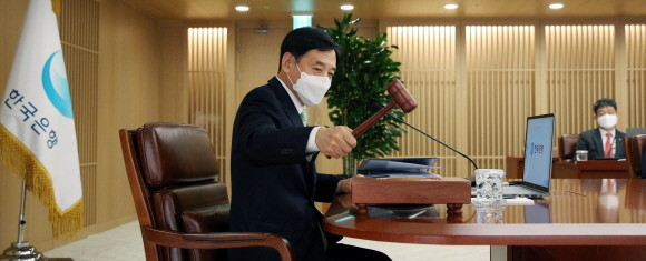 이주열 한국은행 총재가 27일 서울 중구 한국은행에서 열린 금융통화위원회에서 의사봉을 두드리고 있다. Ⓒ 한국은행
