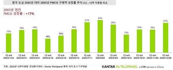중국 도심 2002년 대비 2003년 FMCG 구매액 성장률 추이. ⓒ 칸타