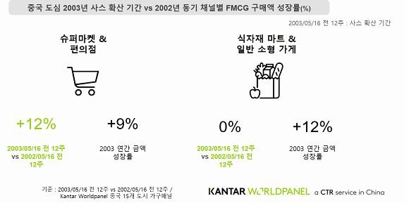 중국 도심 2003년 사스 확산 기간 vs 2002년 동기 채널별 FMCG 구매액 성장률. ⓒ 칸타