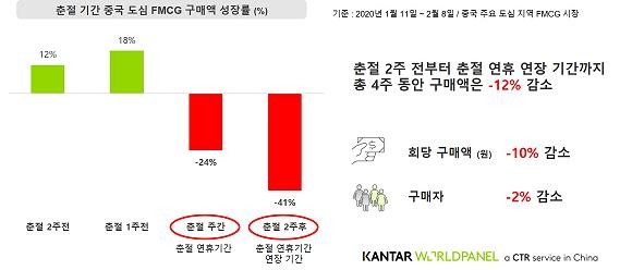 춘절 2주 전 중국 소비자들의 구매액은 15% 증가하며, 2019년 연간 FMCG 성장률 5.3%보다 높은 강한 모습을 보였다. 하지만 중국 정부가 1월23일 후베이성 우한시 봉쇄정책을 시작한 이래로 춘절 주간 첫 주에 구매액은 24% 감소하고, 그 다음 주에는 41% 감소세를 보였다.