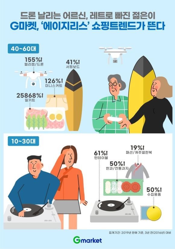 G마켓은 지난 1월에 나이별로 좋아하는 대표 상품들을 뽑아서 지난 2019년 1년동안을 기준으로, 3년 전(2016년)과 비교해서 나이대별로 어떤 물건들이 팔렸는지 조사했어요.