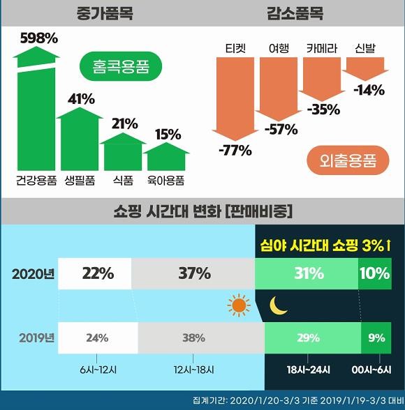 [프라임경제] 이베이코리아가 국내 코로나19 확진 발표가 있었던 지난 1월20일부터 3월3일까지 G마켓과 옥션의 판매 빅데이터를 작년 동기간(1월19일~3월3일)과 비교 분석한 결과, 상품군 및 쇼핑 시간대 등에 변화 추이를 보인다고 6일 밝혔다.