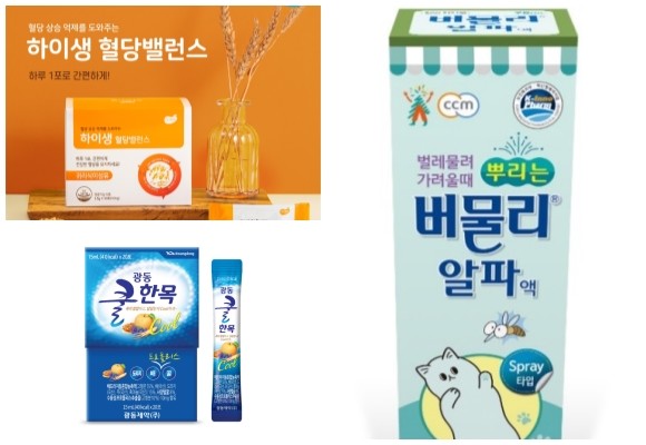 (왼쪽부터 시계방향) 하이모 하이생 혈당밸런스, 현대약품 버물리 알파액, 광동제약 광동쿨한목 스틱포. ⓒ 각 사