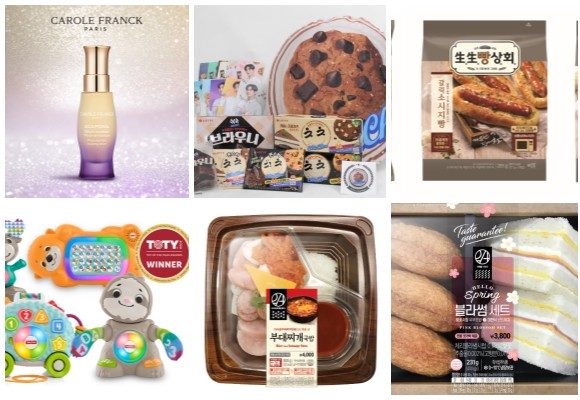 (왼쪽부터 시계방향) CJ오쇼핑 스컬토발 세럼, 11번가 롯데제과X흔한남매 콜라보 한정판세트, 세븐일레븐 생생빵상회, 이마트24 블라썸세트·시즌리스, 손오공 링키멀즈. ⓒ 각 사