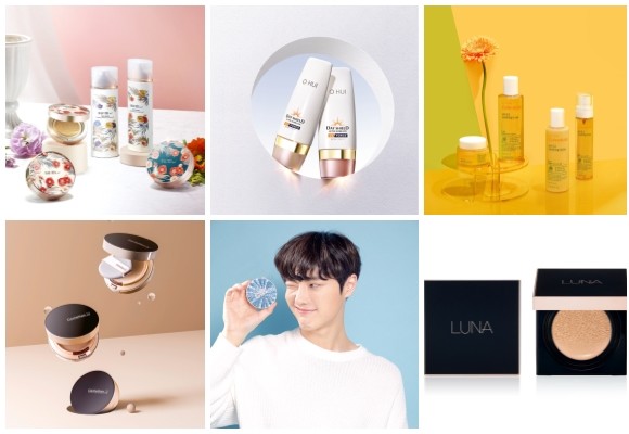 (왼쪽부터 시계방향) 숨37° 트로피컬 블라스트 아트 에디션, 오휘 데이쉴드 울트라 선블럭 UV 포스, 미샤 순하다 카렌듈라 pH5.5 4품목, 루나 롱래스팅 컨실웨어 쿠션, 끌레드벨 쿠션 3종 CSY 리미티드 에디션, 센텔리안 마데카 블레미쉬 커버크림 팩트. ⓒ 각 사