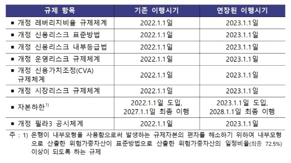한은 관계자는 "바젤Ⅲ 규제체계 최종 이행시기 연장으로 국내은행은 규제이행 부담이 완화될 것"이라며 "이에 따라 코로나19 대응을 위한 금융서비스 지원을 강화할 수 있을 것"이라고 전망했다.