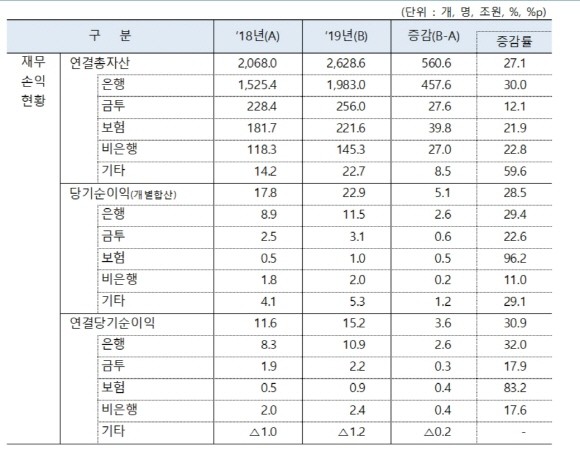 금감원 관계자는 "은행·금융투자회사·보험사 등 지주사 소속 금융부문이 모두 자산 및 이익 증가를 시현하는 등 안정적으로 성장했다"라며 "다만 코로나19에 따른 실물 및 금융부문 충격이 발생함에 따라 올해 실적이 악화될 가능성이 크다"라고 설명했다.