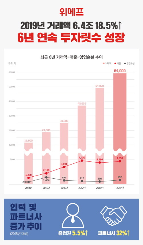 위메프는 6년 연속 거래액 두 자릿수 증가에 성공했다. 위메프는 2019년 실적 최종 집계 결과 연간 거래액(GMV, Gross Merchandise Volume) 6조4000억원을 기록했다고 8일 밝혔다. 매출과 영업손실은 각각 4653억원, 757억원이다.
