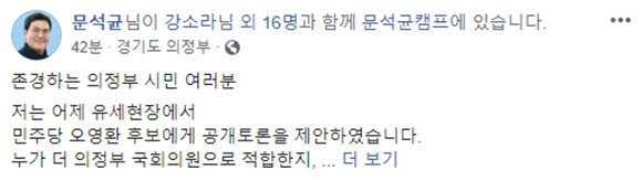 문 후보는 이날 본인의 SNS 계정에 "전날 유세현장에서 오 후보에게 공개토론을 제안했다"면서 "누가 더 의정부 국회의원으로 적합한지, 의정부 시민 여러분께 평가를 받기 원한다"고 밝혔다.
