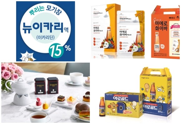 (왼쪽부터 시계방향) 현대약품 뉴이카리액 리뉴얼·미에로화이바 스페셜패키지, 일동제약 아로골드D·아로골드D플러스 리뉴얼, 올댓호텔 티타임 에디션. ⓒ 각 사