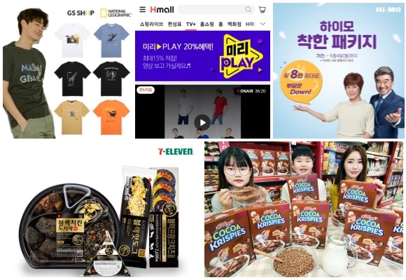 (왼쪽부터 시계방향) GS샵 내셔널지오그래픽 그린티 컬렉션, 현대홈쇼핑 플러스샵 미리 플레이 서비스 론칭, 하이모 착한 패키지, 홈플러스 켈로그 코코아 크리스피 판매, 세븐일레븐 블랙푸드 활용 간편식 시리즈. ⓒ 각 사