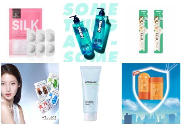 (왼쪽부터 시계방향) 실크테라피 실크 인 캡슐 헤어 마스크, 스키니 쿨민트 올인원 워시, 2080 헬퍼 칫솔, 네이처리퍼블릭 캘리포니아 알로에 보송 선블럭 SPF50+, 아토팜 수딩 젤 로션·판테놀 워터리 플루이드, 웰라쥬 원데이키트 리뉴얼 출시. ⓒ 각 사
