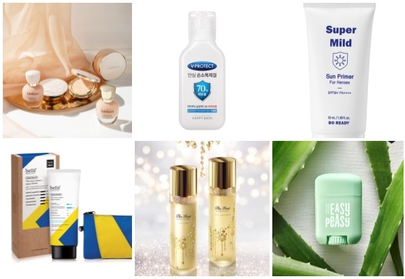 (왼쪽부터 시계방향) 설화수 퍼펙팅 메이크업 라인, 해피바스 V-PROTECT 라인, 비레디 슈퍼 마일드 선 프라이머 포 히어로즈, 이지피피 알로에 코튼 선스틱, 오휘 더 퍼스트 제너츄어 시그니처 세트-클래식 화이트 에디션, 빌리프 더 트루 크림-아쿠아밤 리디티드 에디션. ⓒ 각 사