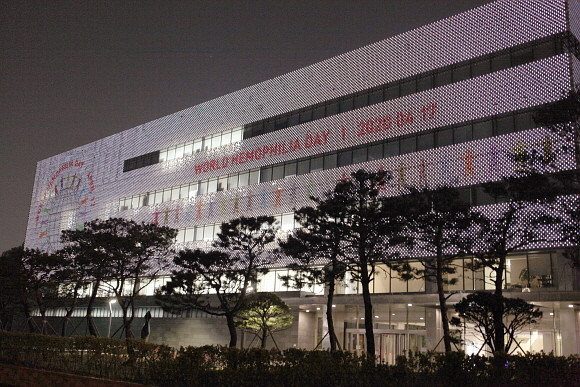 GC녹십자는 지난 16일부터 경기도 용인 GC녹십자 R&D센터 미디어파사드에 세계 혈우인의 날 이미지를 게재했다. ⓒ GC녹십자
