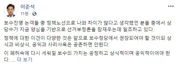 그는 "정책에 대한 이견이 다양한 것은 앞으로 보수정당에서 권장돼야 할 것"이라면서 "(다만) 상식과 비상식, 공익과 사리사욕은 공존하면 안된다"고 표명했다.