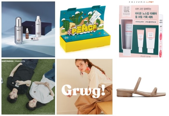 (왼쪽부터 시계방향) CNP Rx 미라클 이펙트 블루 에디션, 빌리프 스트레스 슈터-시카 밤 크림 점보 에디션, 파티온 노스캄 리페어 겔 크림 롭스 단독 기획세트, 메종 마르지엘라 여성용 타비 샌들, 지컷 두 번째 온라인 전용 라인 출시, 스파오-영화 기생충 협업 상품 출시. ⓒ 각 사
