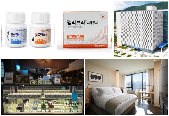 (왼쪽부터 시계방향) 대웅제약 올로맥스 신규 함량 출시, JW중외제약 헴리브라피하주사, 한국콜마-건강약품, 장 정결제 개량신약 이지프렙1.38산, 신라스테이 티빙 올데이 패키지, 글래드호텔 투 밋 블루보틀 패키지. ⓒ 각 사