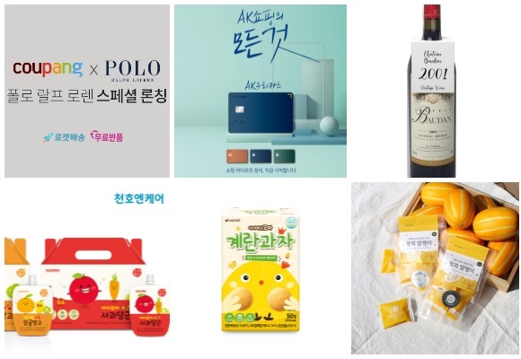 (왼쪽부터 시계방향) 쿠팡 폴로 랄프 로렌 론칭, AK플라자 AK우리카드 시리즈, 이마트24 샤또 보당 2001, 현대백화점 까페옐롱 팝업스토어, 아이배냇 꼬마 계란과자, 천호엔케어 생글생글 감귤망고. ⓒ 각 사