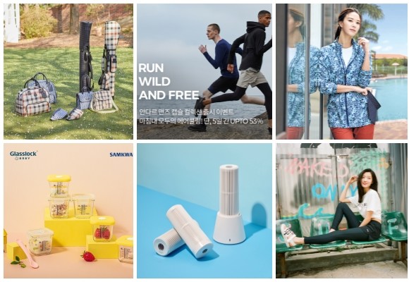 (왼쪽부터 시계방향) 닥스 골프 가방 세트, 안다르 맨 캡슐 컬렉션, 레드페이스 여성용 아웃도어 경량재킷, 롯데백화점-아이더 협업 아이스 레깅스 출시, 모그 스튜디오 디어미 무선 제습기, 삼광글라스 눈금 이유식 영기 큰 용량 2종. ⓒ 각 사