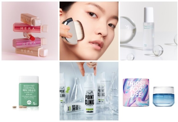 (왼쪽부터 시계방향) 헤라 센슈얼 스파이시 누드 볼륨 매트·에어리 블러 프라이밍 파우더, 아리따움 모디스파 클린 핸드 세니타이저 겔, 라네즈 워터뱅크 리미티드 에디션, 브로앤팁스 포인트 클리닉, 바이탈뷰티 메타그린 슬림. ⓒ 각 사