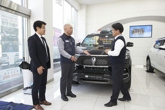 정일권 노조위원장(사진 가운데)이 지난 6일 쌍용차 광교대리점을 방문해 전시된 차량을 둘러보며 중부지역 영업본부 관계자들과 대화를 나누고 있는 모습. ⓒ 쌍용자동차