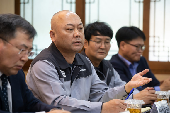 정일권 노조위원장(사진 왼쪽에서 두 번째)이 지난 8일 평택시청에서 열린 노·사·민·정 특별협의체 간담회에서 의견을 전달하고 있는 모습. ⓒ 쌍용자동차