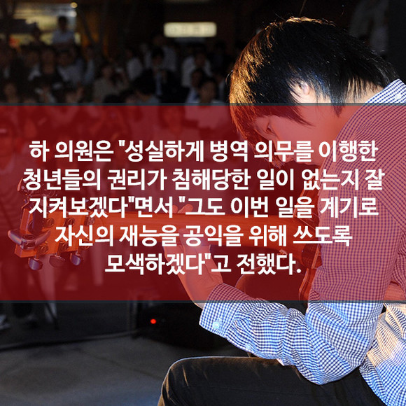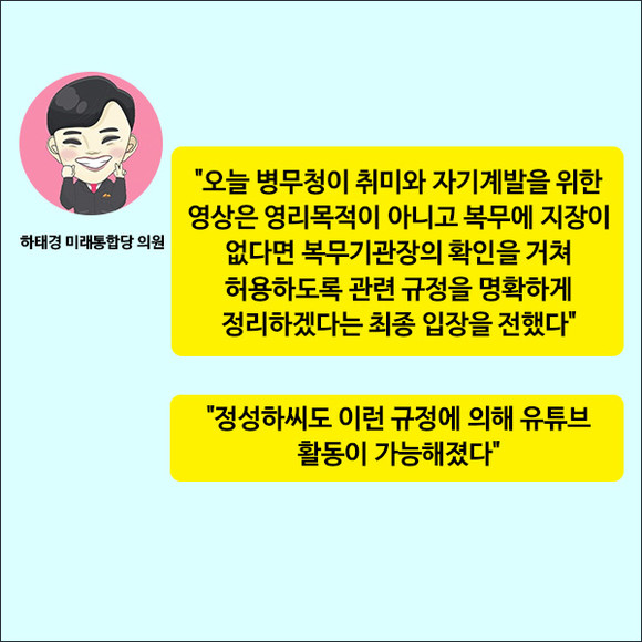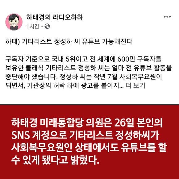 [프라임경제] 하태경 미래통합당 의원은 26일 본인의 SNS 계정으로 기타리스트인 장성하씨가 사회복무요원인 상태에서도 유튜브를 할 수 있게 됐다고 밝혔다.