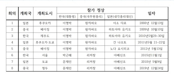 1999년 아세안(ASEAN:동남아국가연합)+3 정상회의를 계기로 열리기 시작한 '한중일 정상회의'는 2008년부터 매년 연례적으로 개최하는 국가정상급 회의입니다. 동아시아 평화와 안정에 기여하고 경제협력 및 관계개선, 재난대책 등 강화를 목적으로 하고 있죠.