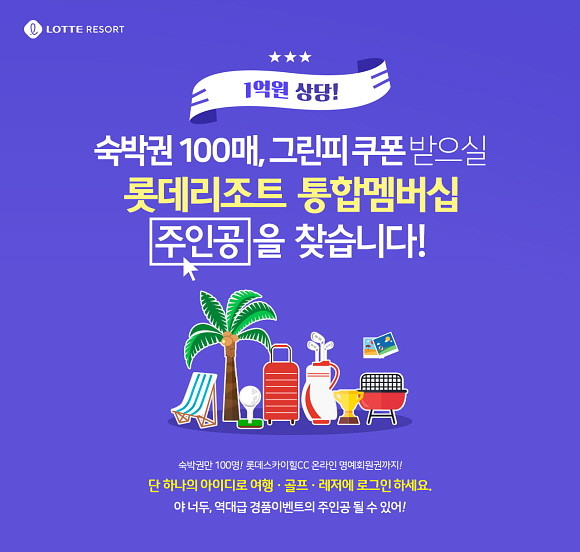 여기에 더해 2일부터는 통합멤버십 오픈 기념으로 롯데리조트 공식홈페이지에서 무려 숙박권 100매가 걸린 파격적인 댓글 이벤트가, 6월8일부터는 롯데스카이힐CC 공식홈페이지에서 온라인 명예회원권(그린피 1팀 무료 쿠폰 10매 증정)이 1등 경품으로 걸린 100% 당첨 룰렛이벤트 등의 풍성한 이벤트가 7월5일까지 이어진다.