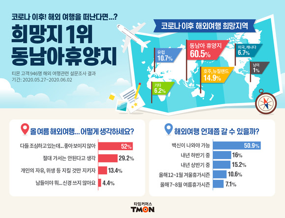 티몬(대표 이진원)이 여름 휴가시즌을 앞두고 최근 1주일간 고객 946명을 대상으로 설문조사를 실시한 결과 응답자의 절반 이상이 휴가 계획을 세우지 않고 있으며, 코로나 이슈가 끝나면 가장 가고 싶은 여행지로 동남아 등 근거리 휴양지를 꼽았다고 4일 밝혔다.